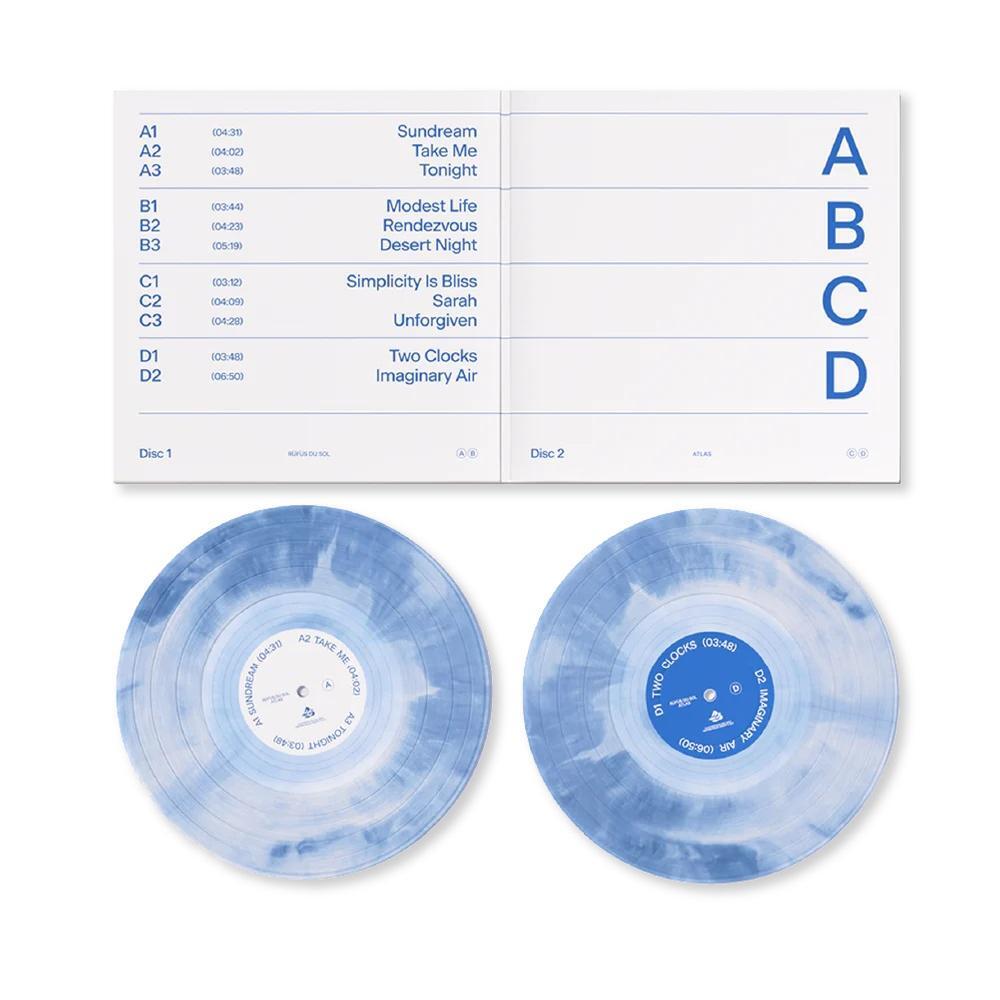 Vinyl release of Rufus Du Sol - Atlas: 10 Year Anniversary Deluxe Edition (Limited Blue & White Marble Coloured Vinyl). Released through Sweat It Out! and available on 3LP.